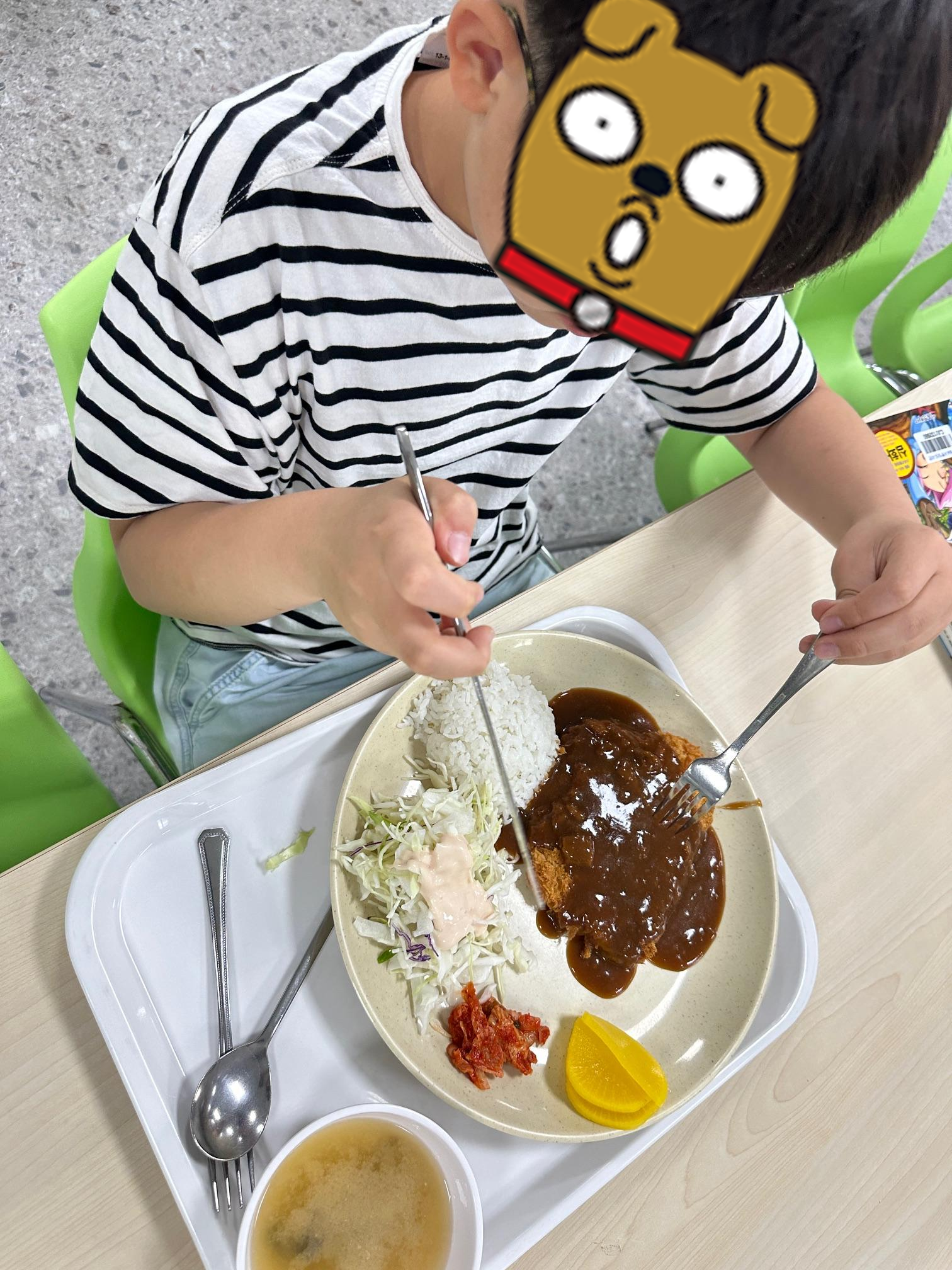 첫째는 돈까스, 둘째는 매점에서 짜파게티 컵라면을 먹었어요.