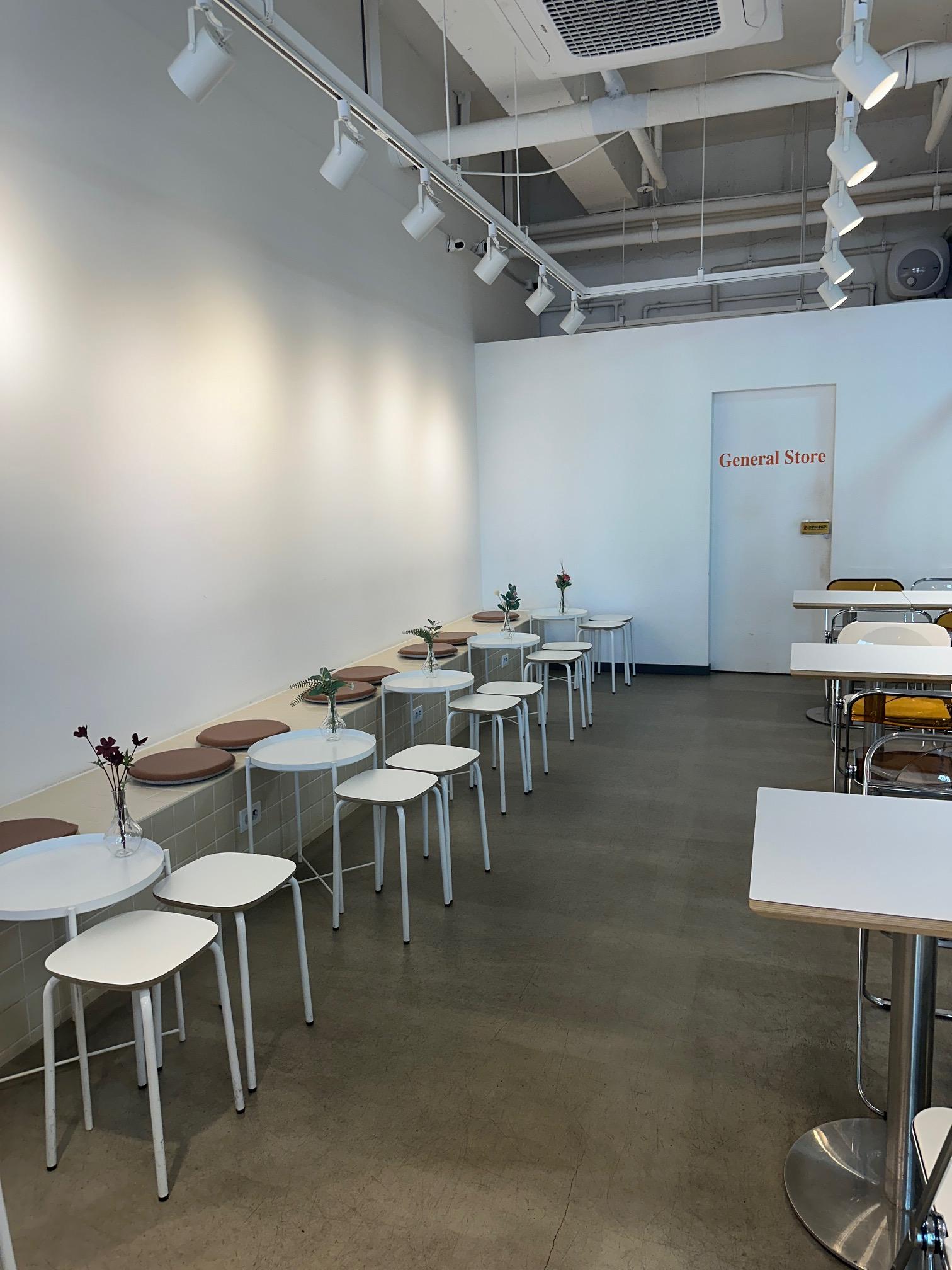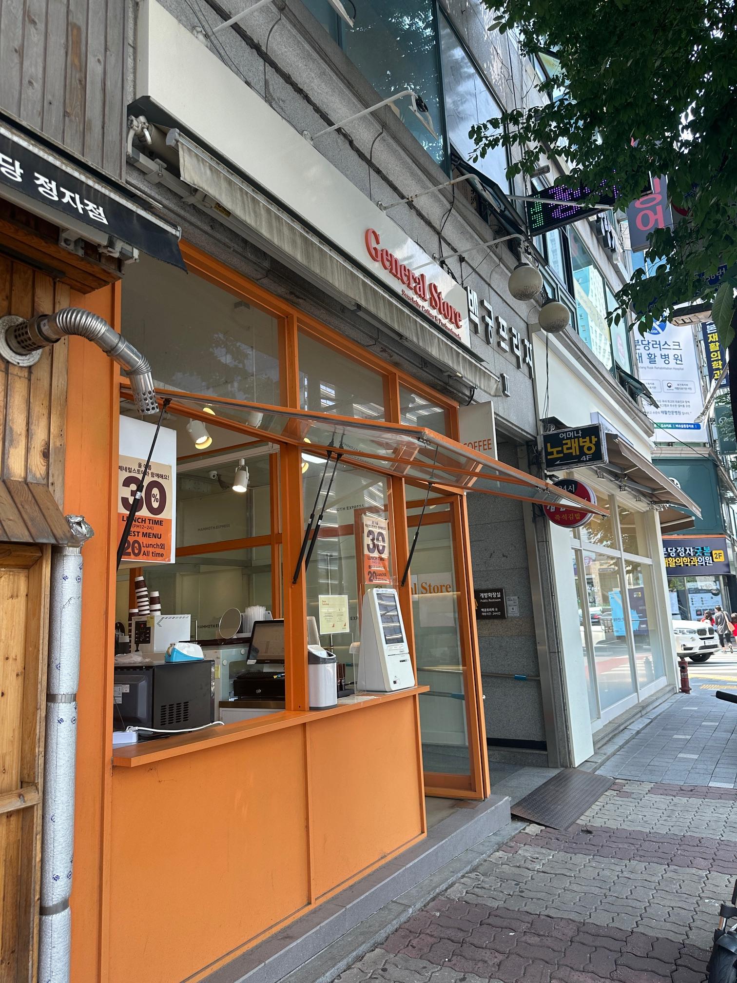 <제네럴스토어>는 정자역 3번 출구에서 약 300미터 정도 떨어져 있는데요 분당경찰서 방향 두산타워 바로 앞에 위치해 있습니다. 근처에 오시면 오렌지빛 아주 상큼한 카페를 바로 보실 수 있어요. 흰 바탕에 오렌지색 간판이 너무 청량하고 인상적이었습니다.